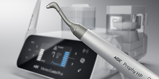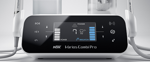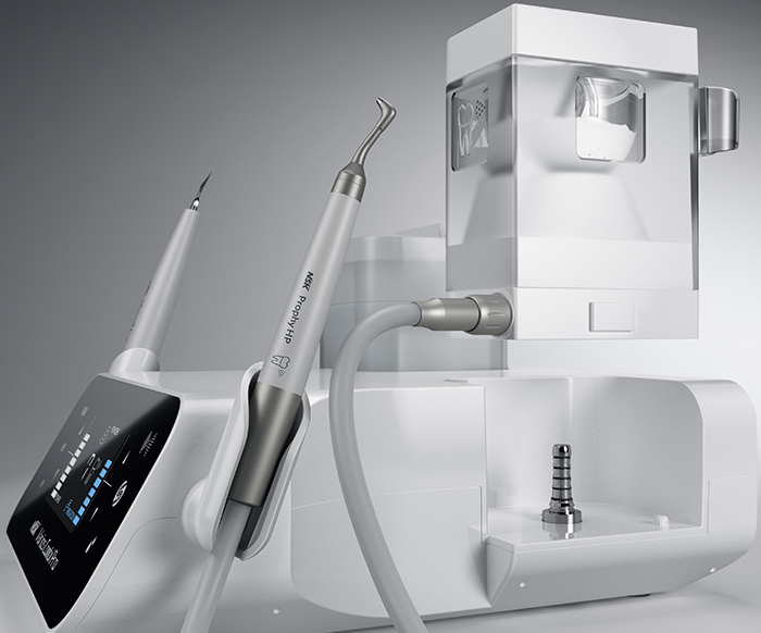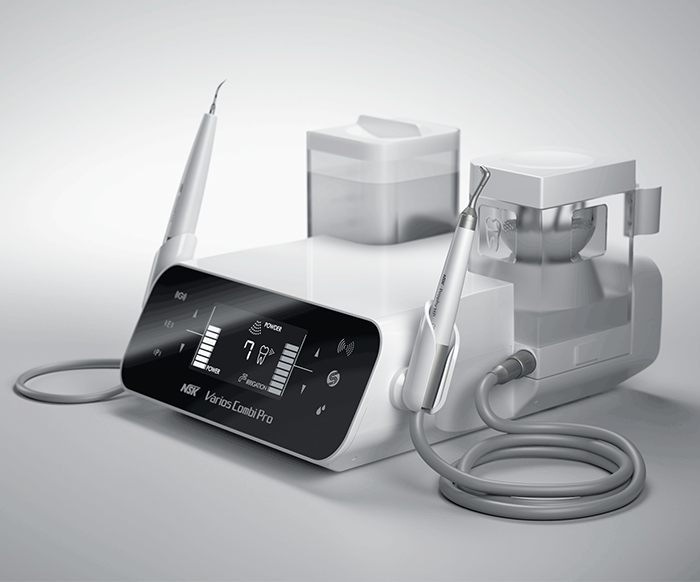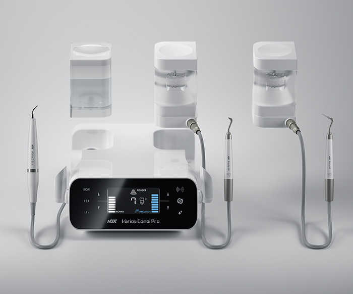 An automatic recognition sensor switches from ultrasonic to powder function when a handpiece is picked up from the holder.
