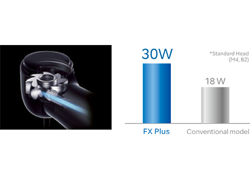 FX Plus, NSK'nın aeratörü simülasyon teknolojilerinin birleşimi sayesinde önceki modellerine göre önemli ölçüde daha güçlüdür. Maksimum 30 watt gücünde olan bu yeni model, sınıfındaki en yüksek güç değerine sahiptir. Bu yoğunlaştırılmış güç, frezin yüksek dönüş hassasiyetiyle birleşerek hızlı ve hassas tedaviler sağlayan sinerjik bir etki yaratır.
